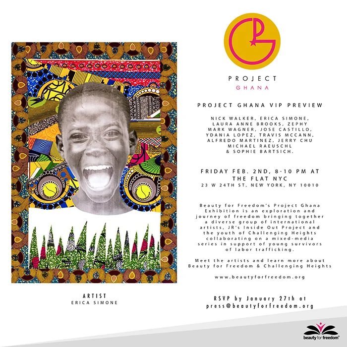 In partnership with JR’s Inside Out Project and Challenging Heights, on February 2nd, 2018, Beauty for Freedom and The Flat NYC Present The “Project Ghana” Exhibition (8-10pm at The Flat NYC - 23 W 24th St, New York, NY 10010), featuring 15 renowned artists in collaboration with the young survivors and at-risk youth of Challenging Heights, and produced by founders, Monica Watkins, and Jer- ry Chu. Exhibiting Artists Include: Nick Walker, Cope2, Erica Simone, YDA Lopez, Mark Wagner, Laura Anne Brooks, Jose Castillo, Alfredo Martinez, Michael Raeuschl, Zephy, Travis McCann, Jerry Chu, and Sophie Bartsich. 100% of the proceeds of the artwork sold will benefit the rescue and recovery programming for CH and BFF’s arts therapy programming.